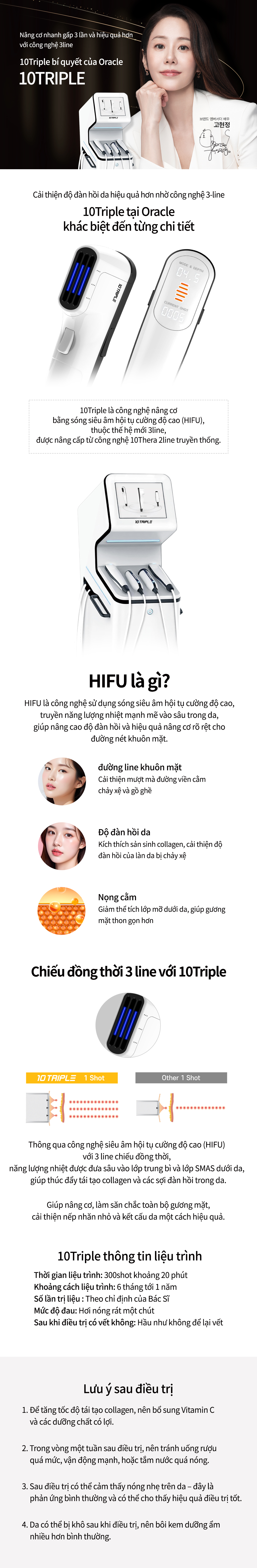Thông qua công nghệ chiếu đồng thời 3 line HIFU, năng lượng nhiệt được đưa vào lớp trung bì và lớp SMAS dưới da, thúc đẩy tái tạo collagen và các sợi đàn hồi. Mang lại hiệu quả nâng cơ, làm săn chắc toàn mặt, cải thiện nếp nhăn nhỏ và kết cấu da.